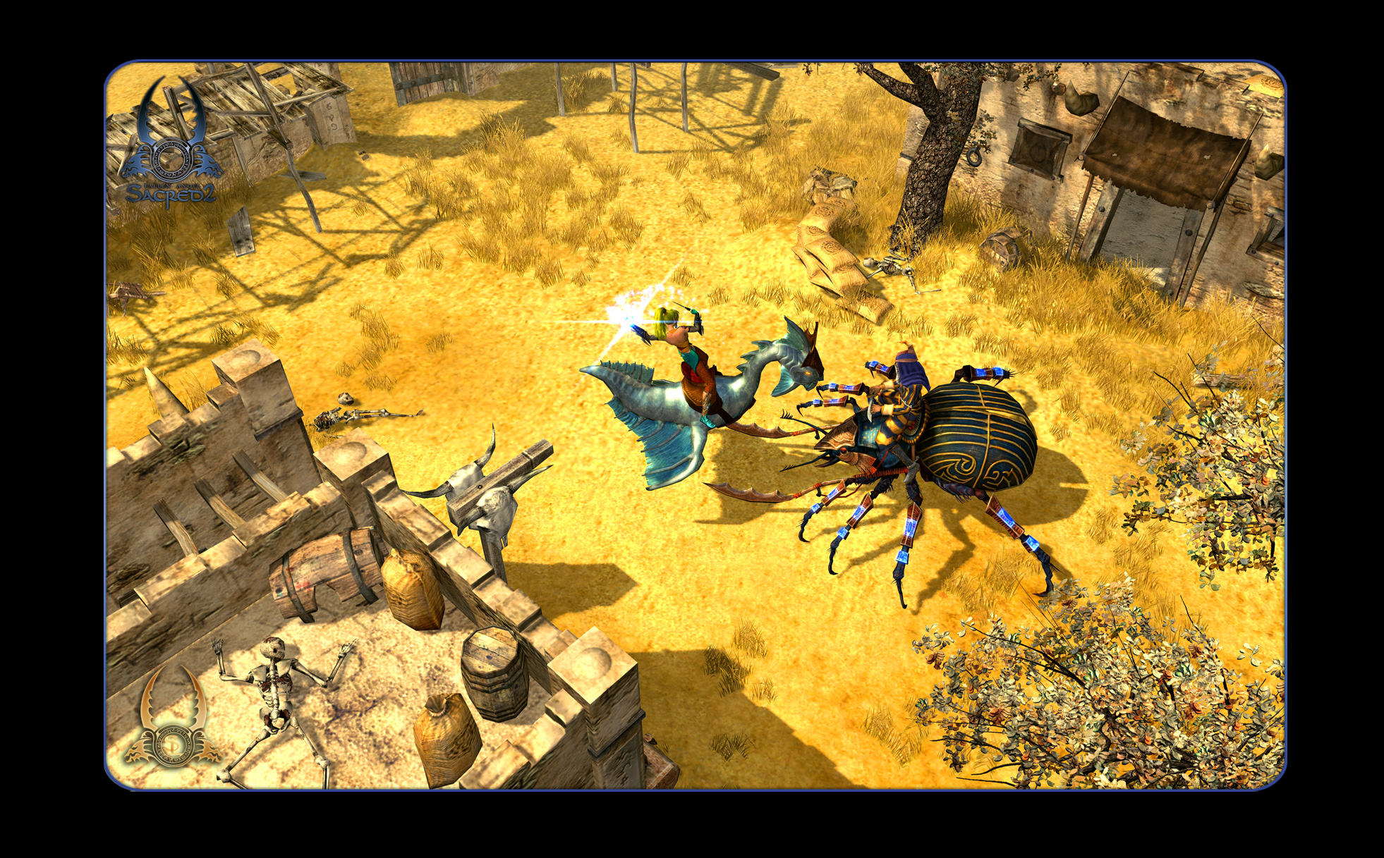 | Super wygląda ten chrabąszcz, taki kolorowy w paski. Ale chyba jest wrogiem, bo HE jakoś go atakuje jakimś piorunem, a szkoda chętnie bym się przejechał takim zwierzakiem. A co do wierzchowca Wysokiej Elfki to jakoś nie bardzo mi się podoba (może przez ten kolor, bo nie lubię niebieskiego). Ogólnie budynki są ładne, a wszędzie rozrzucone kości oddają surowy klimat pustyni. |