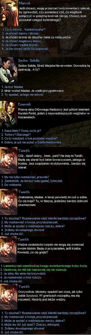 | To jest Neverwinter, prawda? Co niektóre teksty rozpoznaję, ale innych nie. Zwłaszcza wypowiedzi bohatera. Kim właściwie była Madae? Orczycą? To mi pasowałoby do takiego typu odzywek. |